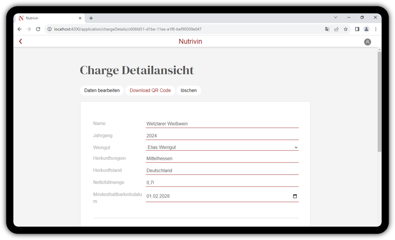Danach können sie in der Detailansicht einen QR Code generieren und herunterladen. Über diesen sind dann ihre Daten sichtbar, Sie können ihn also jetzt z.B. auf das Etikett der entsprechenden Charge drucken.