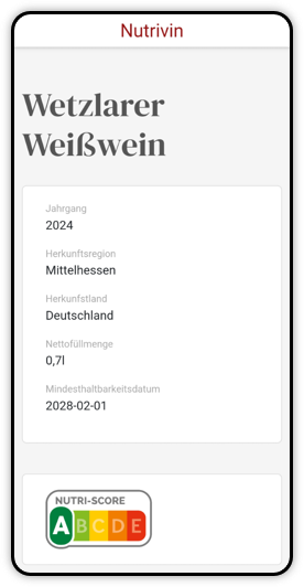 Nutrivin bietet Ihnen eine Plattform um Informationen wie Nutriscore, Nährwerttabellen und viele mehr im Internet abzuspeichern. Diese kann dann der Kunde ganz schnell und unkompliziert per QR Code auf der Flasche abscannen.